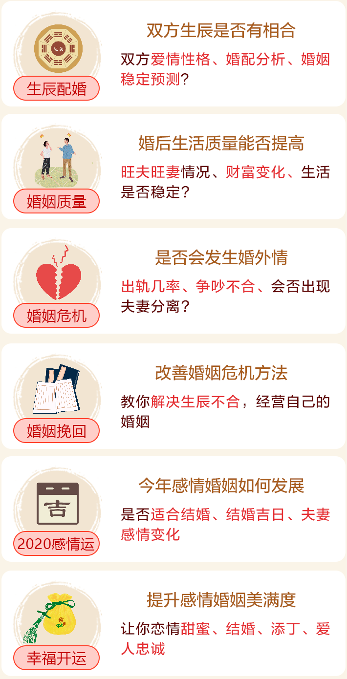 结婚后,老公对家里就不管不问,早出晚归,带孩子和家务都是自己一个人做,两个人的感情也慢慢变淡, 有时候在想是不是我命不好,也比较迷茫,测过命格才了解始末,预测我婚后生活阻碍多还真准啊, 老师也给出了我后天补救的方案,期待能起到作用!
